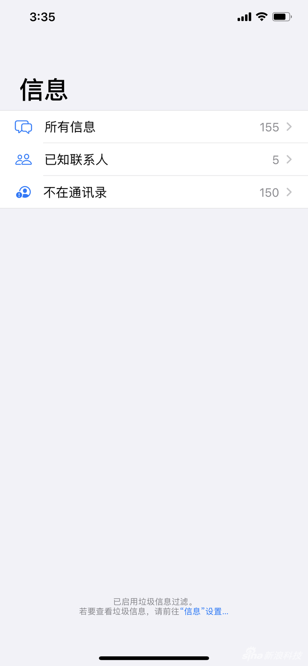曾经很长的一段时间,垃圾信息遍布终端。在iOS13中,对垃圾信息进行了很好的遏制。只要在信息设置中,开启“过滤未知发件人”就可以做到,这会关闭不在通讯录中的发件人的iMessage信息通知。