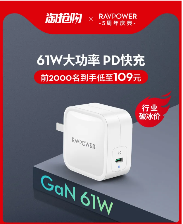 RAVPOWER首次在61W氮化镓快充上做出了大胆尝试,将60-65W级别的氮化镓售价破冰至109元,同时也把氮化镓快充充电器拉下高价的神坛,成为人人都用的起的产品。