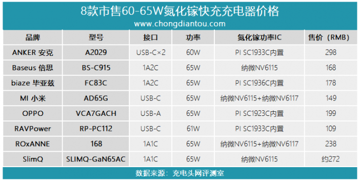 充电头网例举了目前市面上在售的60-65W氮化镓快充充电器的售价,包括ANKER、RVAPOWER、倍思、毕亚兹、小米、OPPO、SlimQ等品牌在内的8款产品。