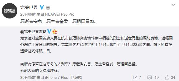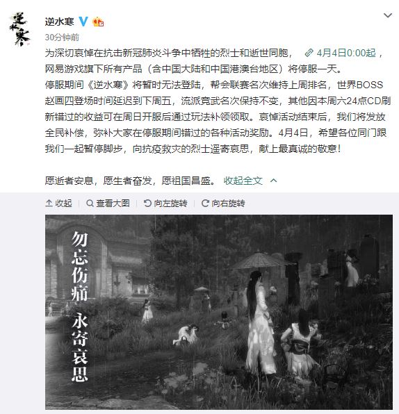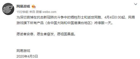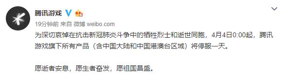今日(4月3日),腾讯游戏、网易游戏发布公告,宣布从4月4日0:00起,两家公司旗下的所有产品停服一天。官方公告:腾讯游戏和网易游戏表示停服的原因是“为深切哀悼在抗击新冠肺炎斗争中的牺牲烈士和逝世同胞”,除了停服之外,二者的头像也都换成了灰白色。