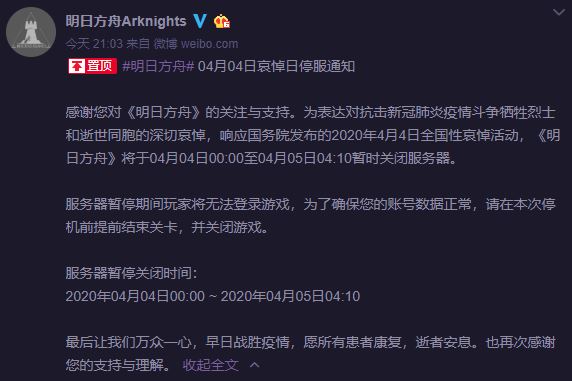 包括网游《逆水寒》,手游《FGO》、《明日方舟》、《碧蓝航线》等作品在内,大量游戏都发布了停服一天的通知: