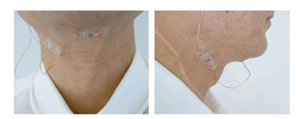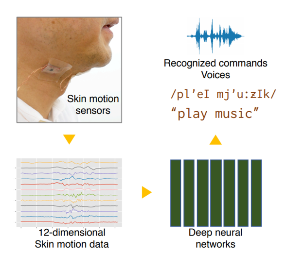 就其原理而言,如下图所示,在喉咙周边的皮肤上贴上一个加速度/角速度传感器,获取无声发声时下颚、舌肌运动引起的从下颚到喉咙的皮肤颤动信息,采用深度学习进行分析识别,最终实现将无声语音转换为语音输入的无声语音交互(Silent Speech Interaction,SSI)。