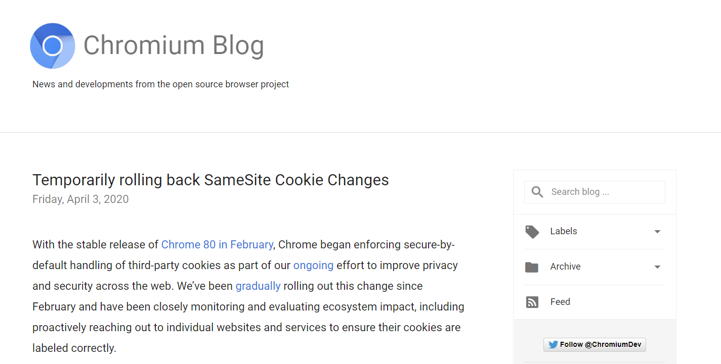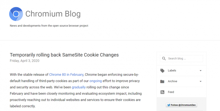 Chrome 工程总监 Justin Schuh 在 Chromium Blog 发文宣布暂时回滚 SameSite Cookie 功能,以确保新冠病毒疫情期间网站的稳定性。SameSite 是全新的 cookie 分类模型,在二月初发布的 Chrome 80 稳定版中被引入。Chrome 会将没有声明 SameSite 值的 cookie 默认设置为 SameSite=Lax 。