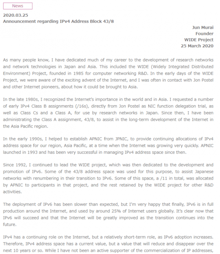 3 月 25 日,IPv6 倡导者 Jun Murai 宣布,他将出售超过 1400 万个 IPv4 地址,所有收益将以信托基金的方式,用于提升亚太地区的互联网服务,进一步填补甚至消除全球性的数字鸿沟。