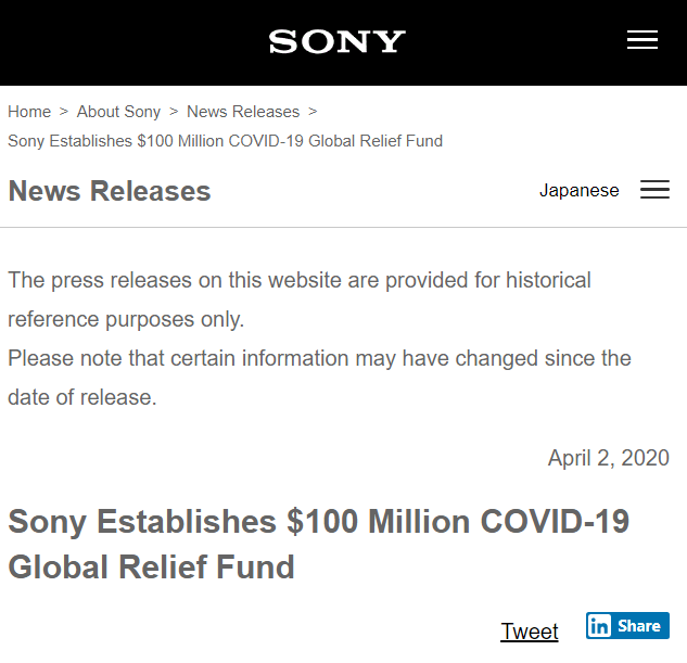 为克服当今世界所面临的前所未有的挑战,索尼将作为一家全球性的公司而竭尽所能,与坚守抗击 COVID-19 疫情一线的个人、属于未来希望的儿童、以及创意社区中受到影响的人们并肩同行。