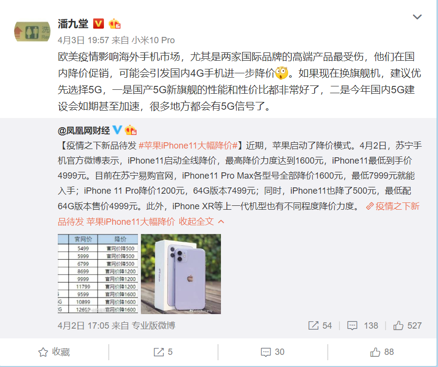 小米产业投资部合伙人潘九堂指出,欧美疫情影响海外手机市场,尤其是两家国际品牌的高端产品最受伤,他们在国内降价促销,可能会引发国内4G手机进一步降价。