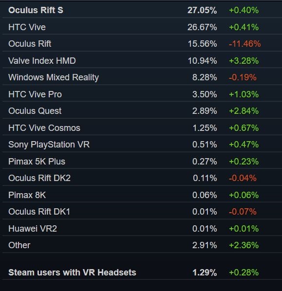 《PC Gamer》杂志曾将无需定位基站的Oculus Quest评为性价比最高的VR装置,该设备占比目前仅有2.89%。