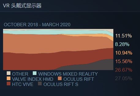 这一百多万人中,最流行的头戴装置是Oculus的Rift系列,其次是HTC Vive;V社自己的Index涨幅最大且占比11%,显示高昂的售价并未影响玩家的尝鲜冲动。