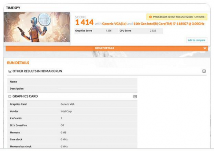 第十代酷睿H处理器2天前才刚刚发布,第11代酷睿U处理器的成绩就出现在网上了。近日,@rogame在推特曝光了Core i7-1185G7处理器的3DMark跑分截图,其中核显的成绩令人刮目相看。