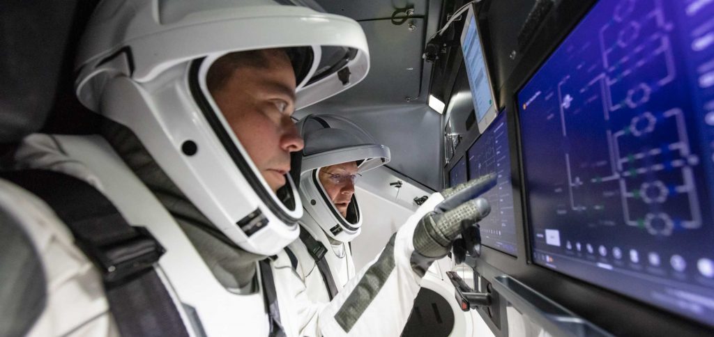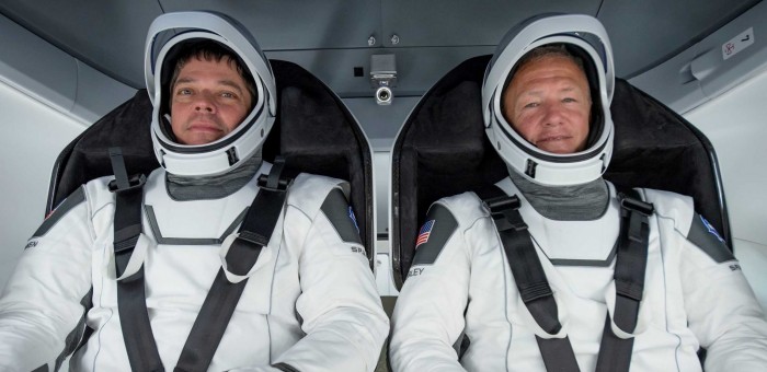 图1:美国宇航局宇航员鲍勃·本肯和道格·赫尔利于3月30日进入SpaceX准备发射的载人龙飞船,为5月份首次载人飞行做准备