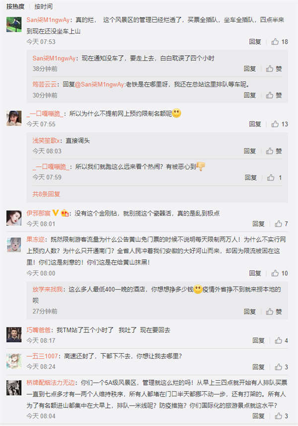 另外,黄山作为5A级风景区管理上的不足也让网友们愤怒吐槽:限流未公告、没有网上预约、只开通南门、买票插队、坐车插队……