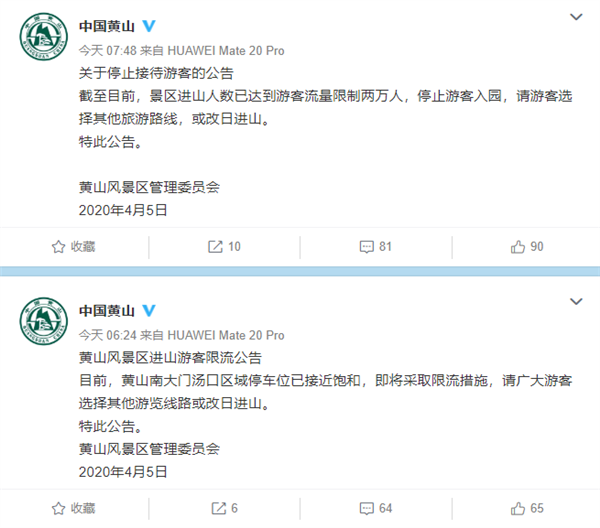 7点48分,黄山风景区再次发布公告,宣布进山人数已达到游客流量限制2万人,停止游客入园。