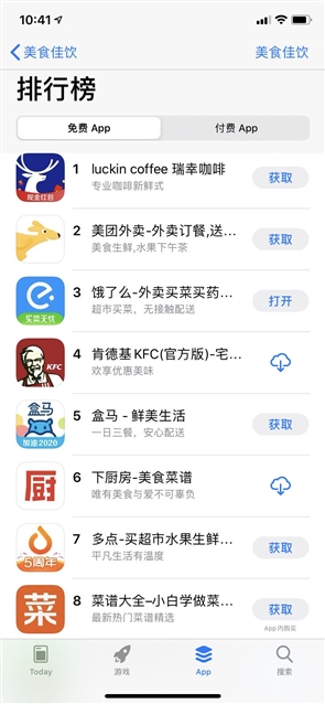 随着用户的不断努力,近日,瑞幸APP成功超越美团饿了么,登顶APP Store美食榜,在总榜中也仅次于近日大火的个人所得税APP,排名第二,评分高达4.3分。
