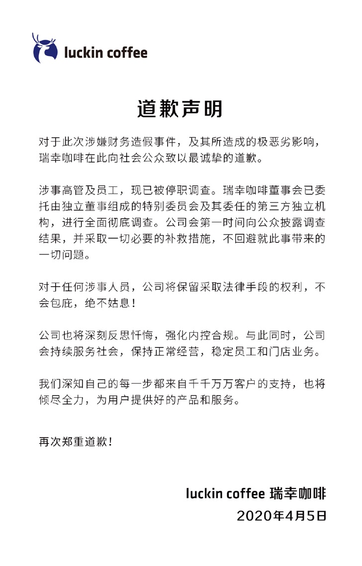 4月5日下午消息,瑞幸咖啡发布道歉声明表示,涉事高管及员工已被停职调查。瑞幸咖啡董事会已委托独立董事组成的特别委员会及委任的第三方独立机构,进行全面彻底调查。
