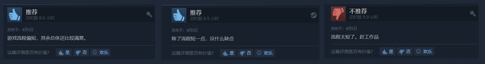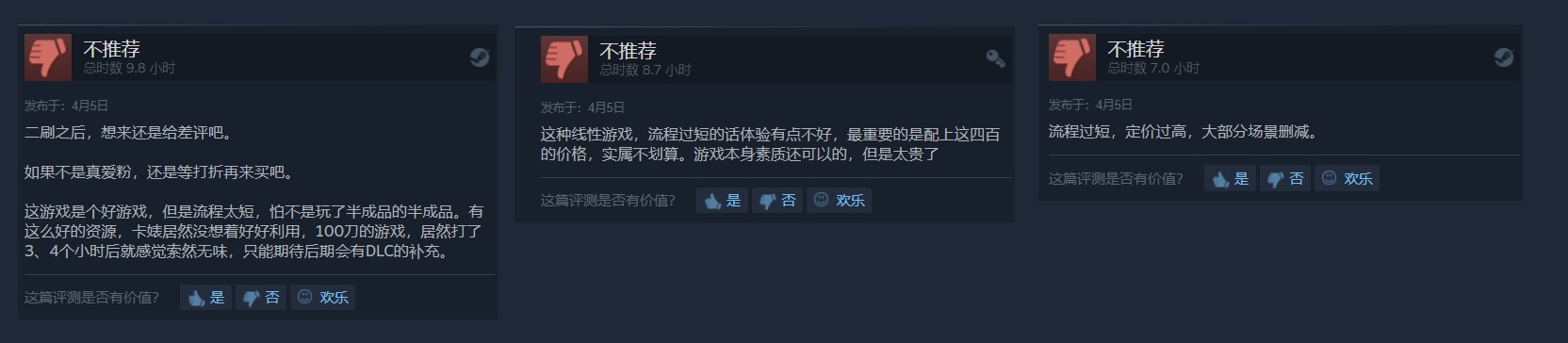 原因其实也很简单,从评价中就不难看出,大多数玩家虽然对于《生化危机3:重制版》的画质、人物建模都十分满意,但游戏高昂的定价(414元)和相比之下过短的流程(6小时)成为了绝大多数玩家选择差评的理由。