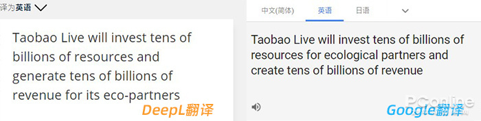 此外还有“淘宝直播”,DeepL的整体逻辑看起来更合理,比较准确地把握到了译文的原意(即淘宝投入百亿资源,去帮助生态伙伴创造百亿收入)。而相对来说,Google翻译的表现更接近直译,虽然整体也还不错,但总是感觉少了一些东西。