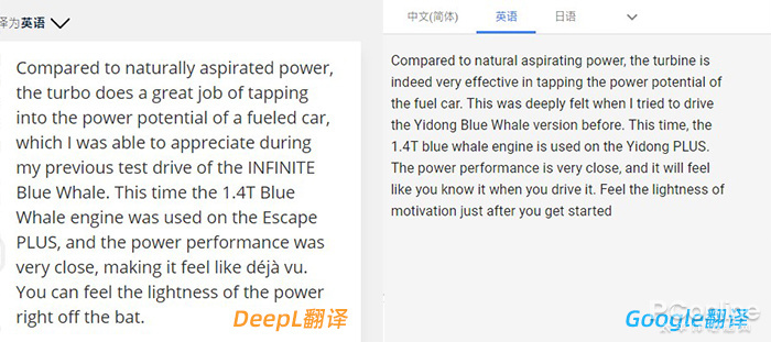 点评:两者的短文翻译,依旧能够看出一些差别。以第一段汉译英为例,前面基本没什么问题,但最后一句“刚上手就能感受到动力带来的轻盈感”在翻译时就能看出不同了。从字面含义理解,DeepL的结果更适合于这篇文章,尤其对“轻盈”这个词的把握,较Google翻译更好一些。