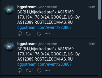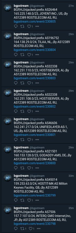 上一次抢占头条的Rostelecom重大劫持事件发生在2017年,当时该电信公司劫持了包括Visa、Mastercard、汇丰银行等全球最大的金融实体的BGP路由。