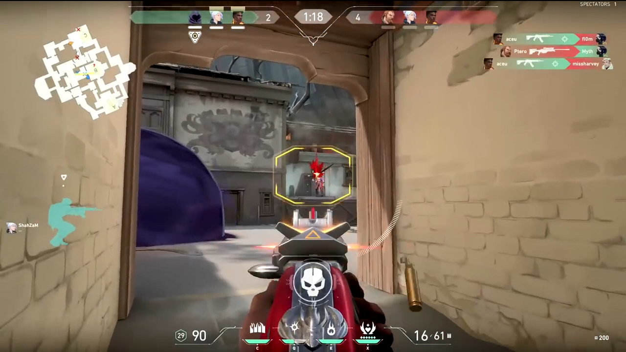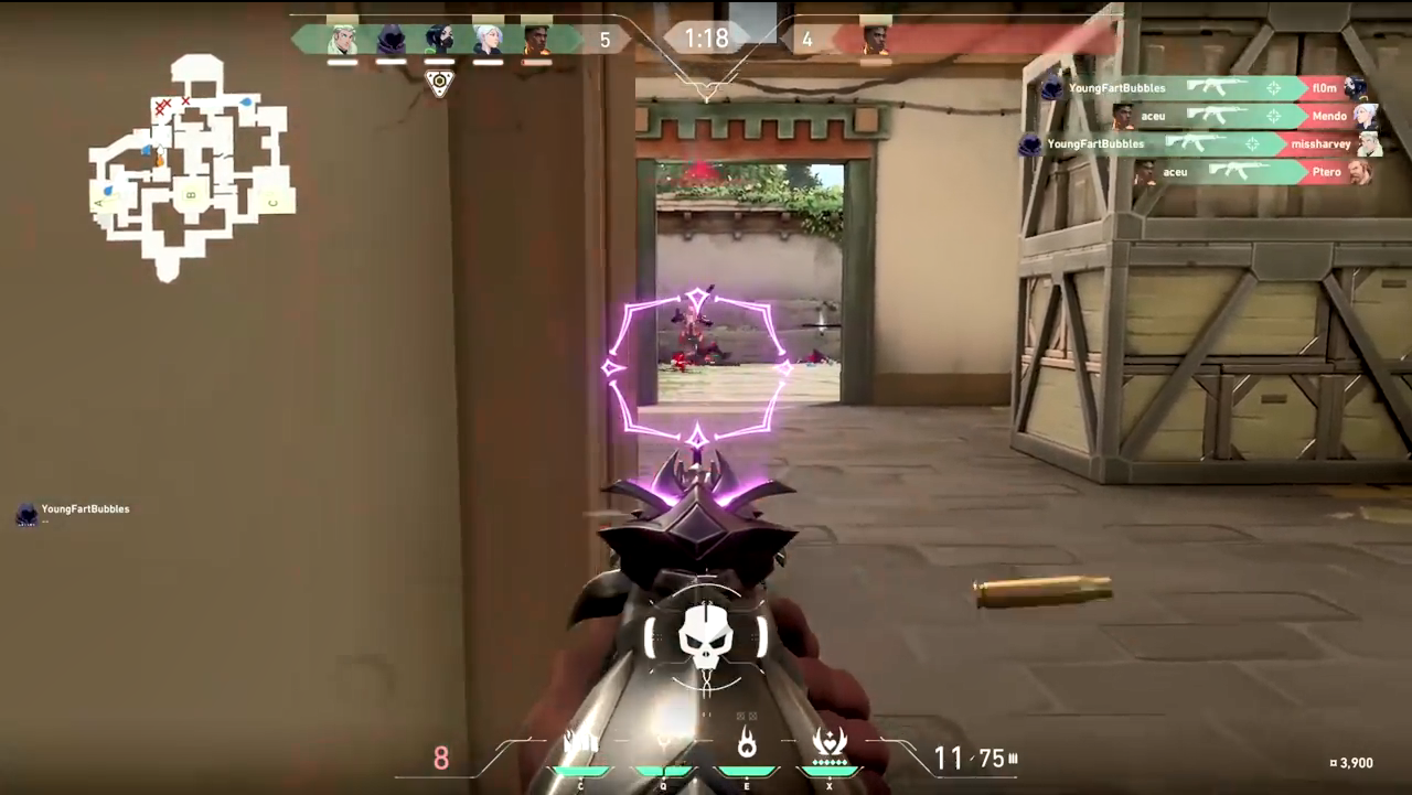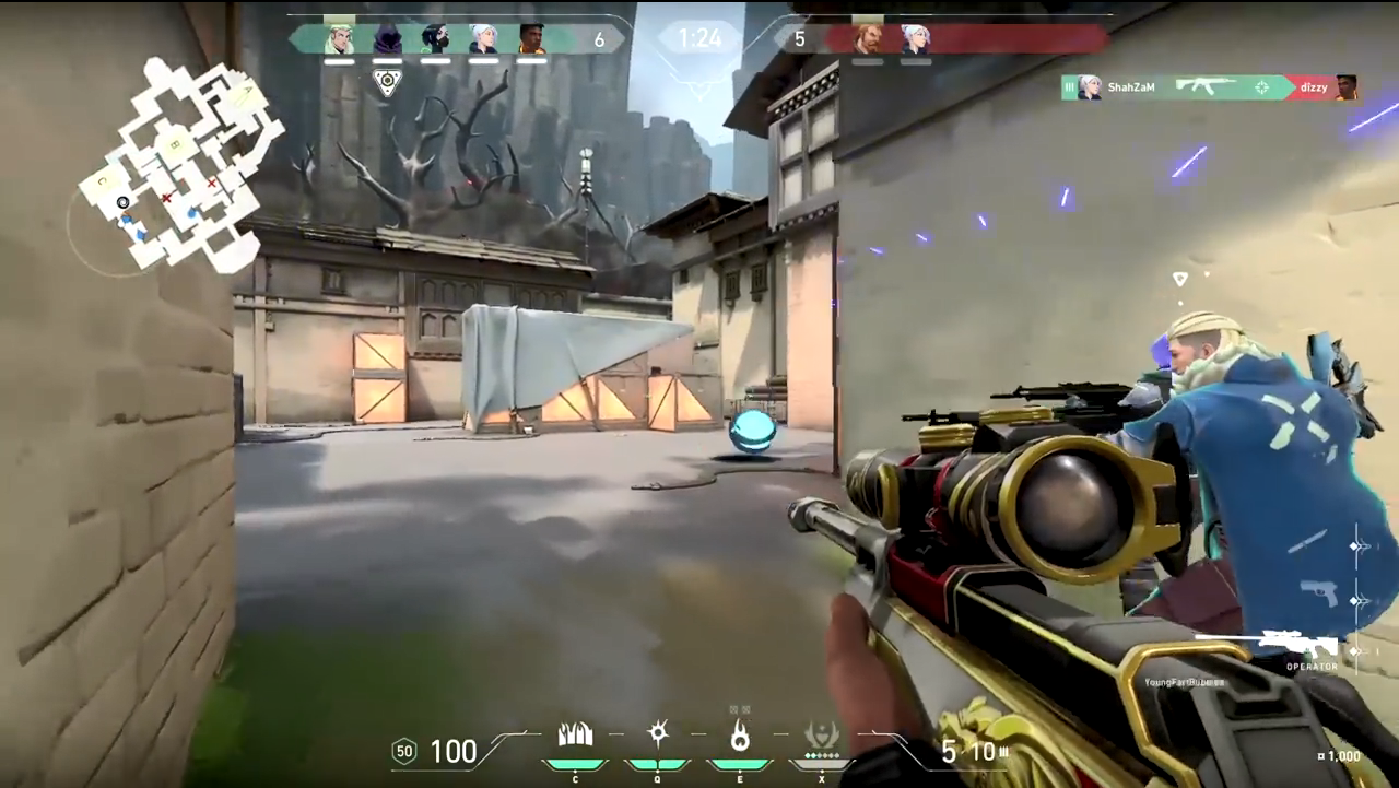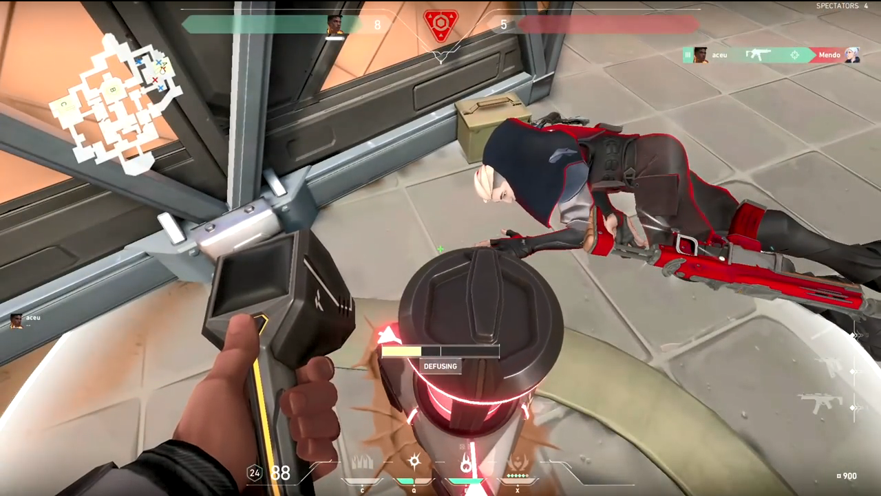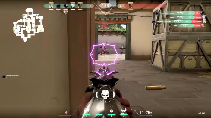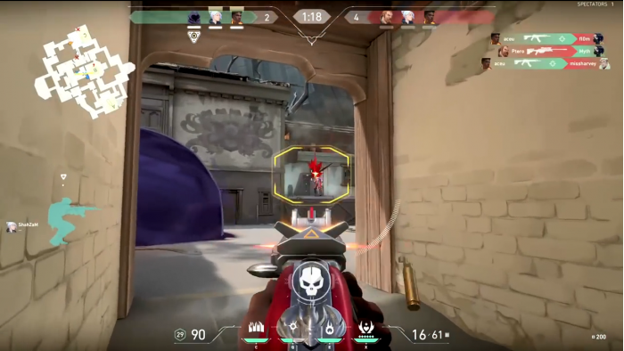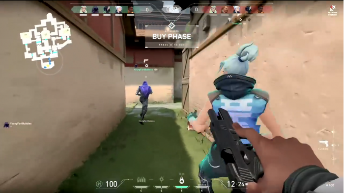 上方视频为战队选手NRG_Aceu在油管发布,可以看到同台竞技的还有dizzy、Mendo等FPS主播。和《CS》类似,视频中展示的为《Valorant》的爆破模式,一方埋雷一方拆弹,一局的时间算上购买等待区间刚刚两分钟。另外演示中的地图非常小,在购买等待区玩家甚至可以走到接近地图中心的区域,开局后见面就是干。