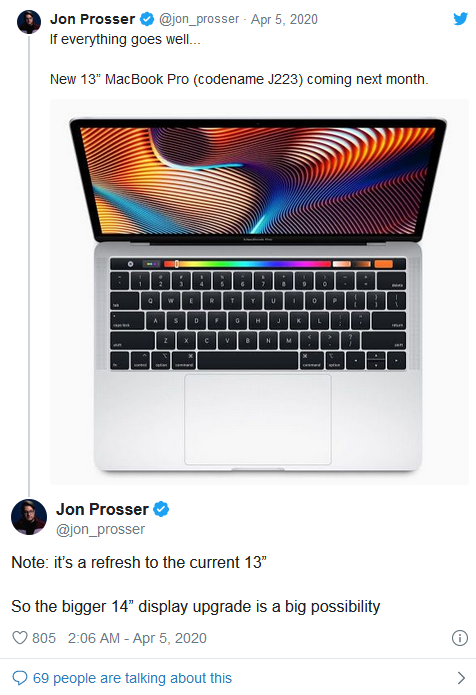 根据YouTuber和泄密者Jon Prosser分享的传闻,苹果将在5月宣布一款代号为J223的13英寸MacBook Pro新机,并将于5月发布。分析师Kuo曾表示,苹果计划在2020年第二季度发布配备剪刀式键盘的新款MacBook Pro和MacBook Air机型。