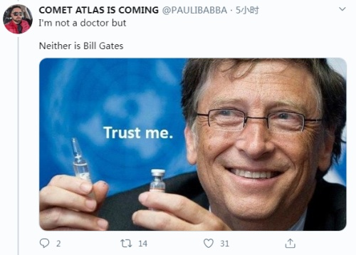 由此,阴谋论者们开始对此深信不疑,认定是比尔·盖茨和他强大的关系网一手造就了病毒传播。对于网友质疑的他为什么要这么做呢?阴谋论者自圆其说:因为他想借此机会,推广自己研发的疫苗,从而进一步控制民众!