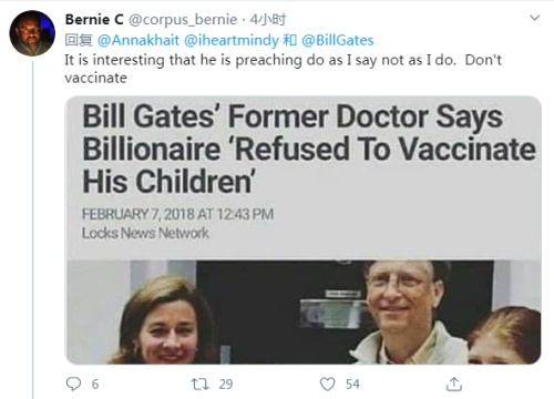 紧接着,阴谋论者们还找到了多年前的报道,称早年比尔·盖茨曾称不会给自己的孩子打疫苗,但现在却在积极研究疫苗,居心何在?