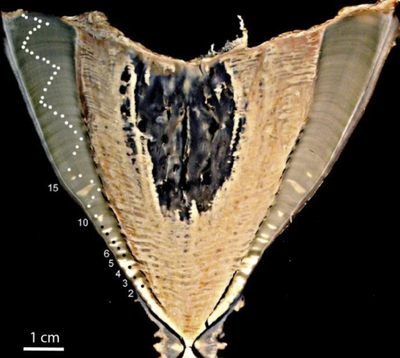 研究人员分析了两只鲸鲨尸体的生长环,评估了整个鲸鲨体内的碳-14含量。然后,生长环中不同水平的放射性同位素含量为科学家提供了一幅清晰的图画,让科学家能够清楚地了解到生长环的形成频率,并由此推断出动物的年龄。