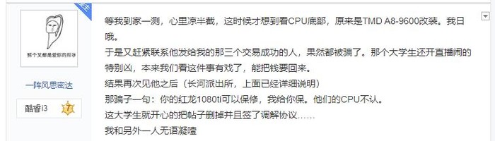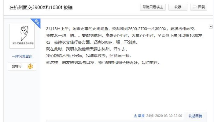 近日,贴吧用户“一阵风思密达”在图拉丁吧发帖,称自己在杭州线下面交Ryzen 9 3900X与GTX 1080 Ti显卡被骗,涉事金额达一万人民币。事主于杭州与骗子线下面交AMD Ryzen 9 3900X处理器三片与微星GTX 1080 Ti红龙一块,事后上机发现CPU不能点亮,显卡也是坏的。