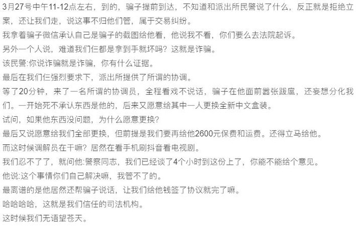 根据事主的微博长文中的描述,骗子称自己与当地长河派出所关系网从上到下,事主到派出所与骗子正面对峙,结果发现民警并不愿意受理该案件,并且有驱赶事主等人的举动。从事主的描述当中可得知,涉事受害者已达10人。