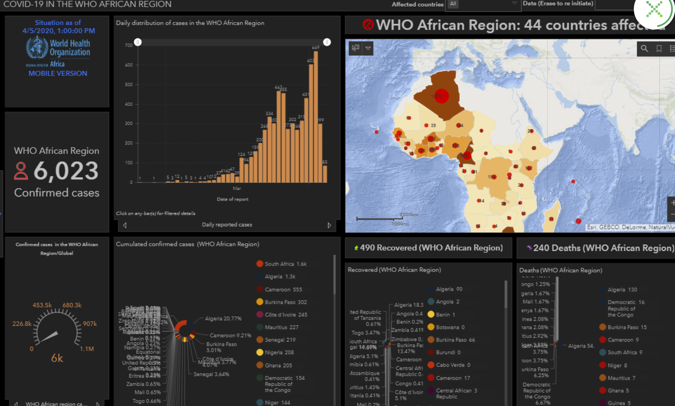 3月初,非洲大陆按国家划分的冠状病毒-19型病例数为个位数,但到了3月中旬,这些数字已经激增,导致世卫组织非洲区域主任Matshidiso Moeti博士在3月19日的新闻发布会上对该病毒发出了警报。根据世界卫生组织周一的统计,撒哈拉以南非洲地区有6023例COVID-19病例,240例确诊死亡病例,比3月18日的463例和8例死亡病例有所增加。