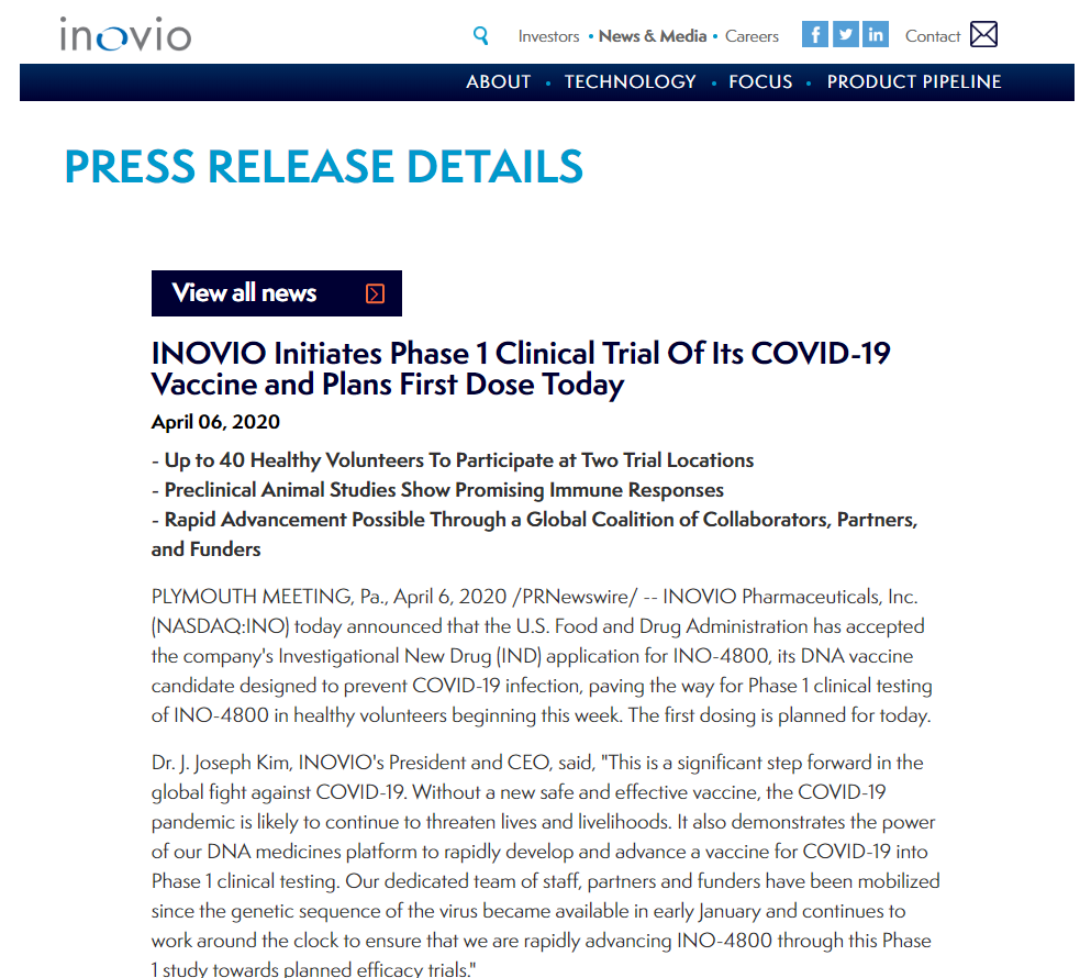 在美国食品和药物管理局(FDA)接受了Inovio制药公司根据监管机构的 "新药研究计划"(Investigational New Drug Program)提出的申请后,一种新的COVID-19疫苗候选疫苗于当地时间周一进入了1期临床人体试验。Inovio公司计划将其开发的INO-4800 DNA候选疫苗注射给第一个志愿者试验对象,此前在对动物进行的临床前研究结果显示免疫反应增强,结果颇具希望。