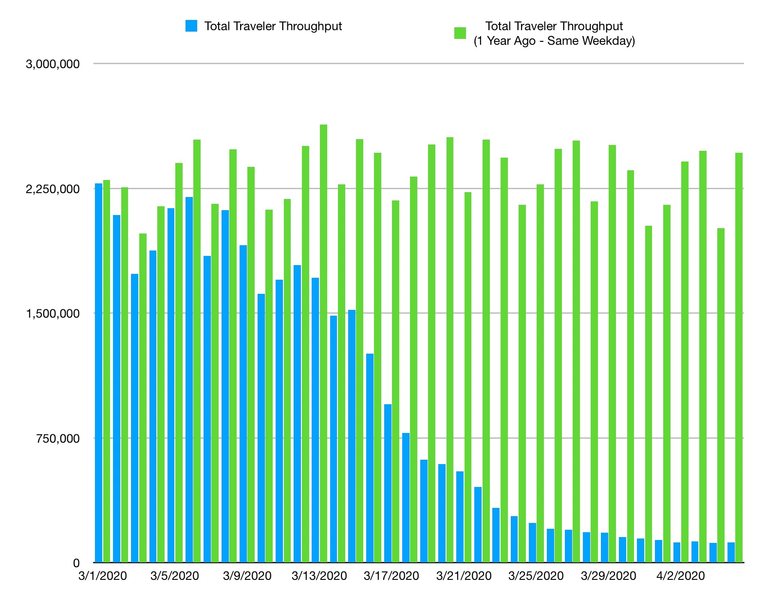 新冠疫情爆发前后的变化显而易见,例如,上周日(4月5日),TSA只有122,029人通过了检查站,而在一年前的同一天,这个数字则有2,462,929人。