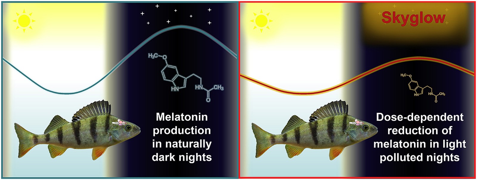 10天后,所有的鲈鱼在24小时内,每3小时检查一次褪黑激素水平。褪黑激素是鱼类和人类等脊椎动物根据感知到的环境亮度而产生的一种激素。一般来说,光线水平越低,产生的褪黑激素的量就越大--身体会根据这些水平的变化来设定自己的昼夜节律,包括睡眠的开始时间。