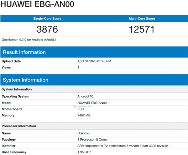 根据Geekbench 4.2数据库最新显示的信息来看,这款型号为EBG-AN00的新机搭载的是当前顶级的麒麟990 5G SoC,配备8GB内存,运行Android 10系统。其单核得分3876,多核得分12571,毫无疑问,该成绩无论是相对于其他搭载了麒麟990 5G SoC的旗舰机型,还是搭载骁龙865的旗舰机型来说都是一个不错的水平。