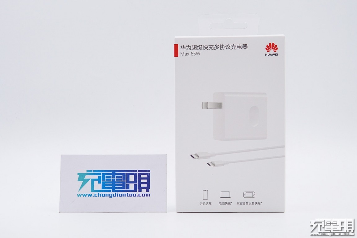 华为超级快充多协议充电器外包装十分简约,正面为充电器和数据线的图片,最大功率65W;产品特点:手机快充、电脑快充、其它影音设备快充。
