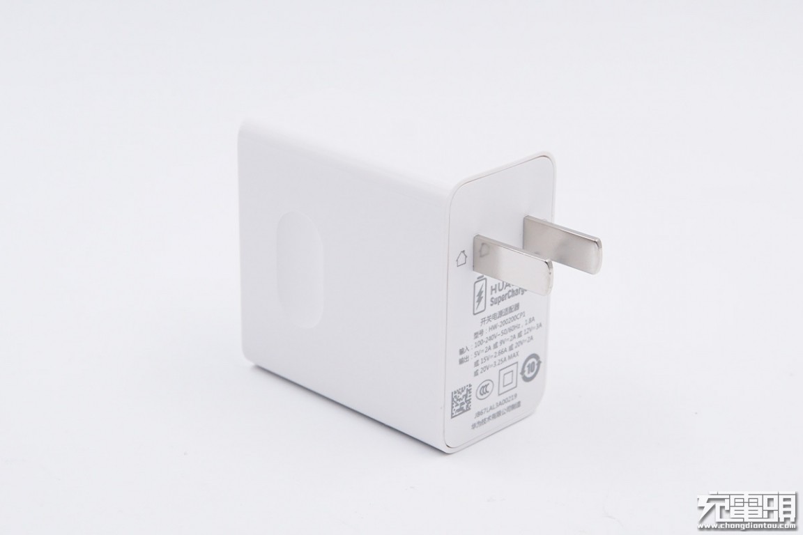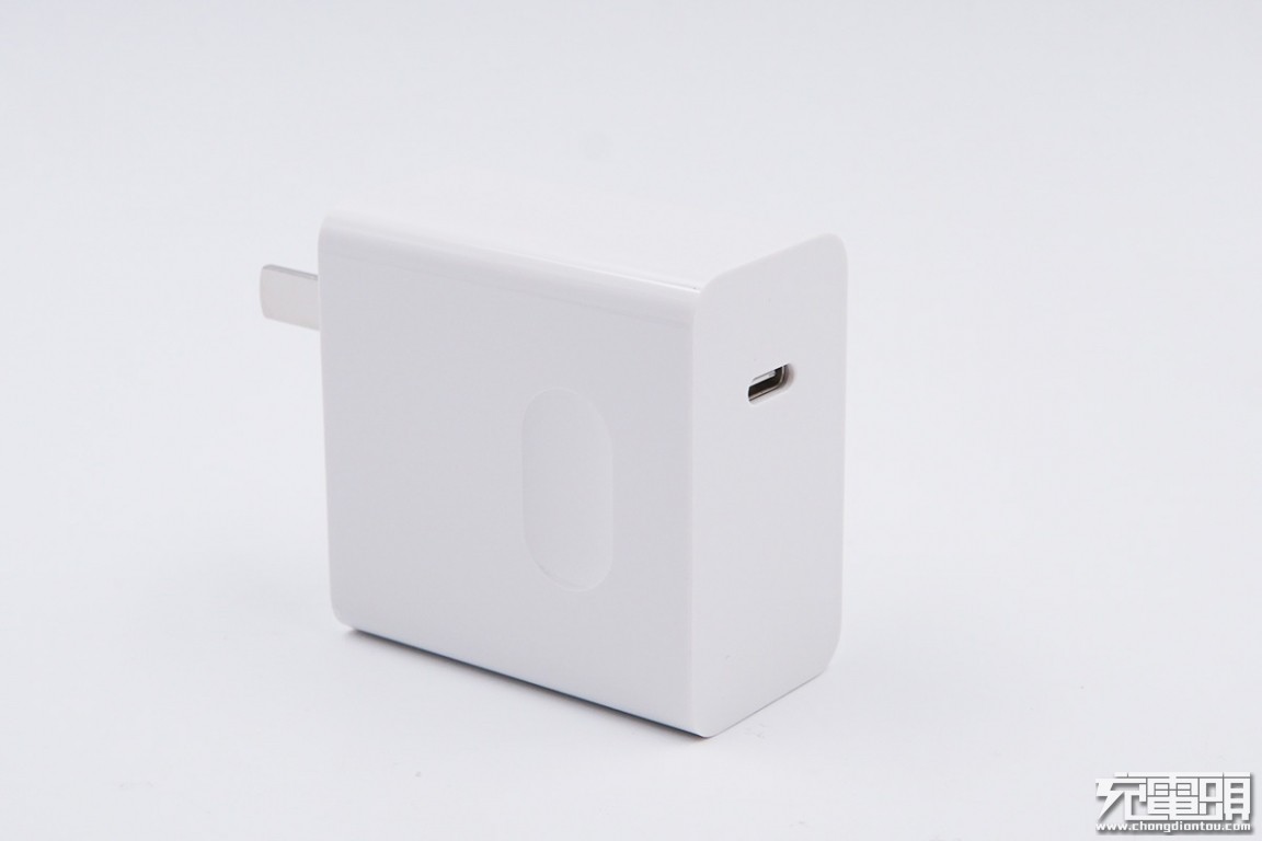 外观方面还是带有浓烈的华为家族气息,白色PC材质外壳,高光亮面处理,机身侧面带有凹陷设计,方便插拔;配不可折叠插脚,输出端为单口USB-C接口。