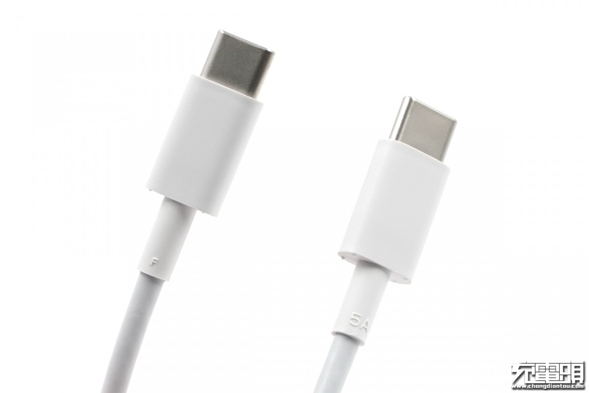 数据线为白色TPE材质,线长约1米,双USB-C接口,接口处印有5A字样,支持大电流。