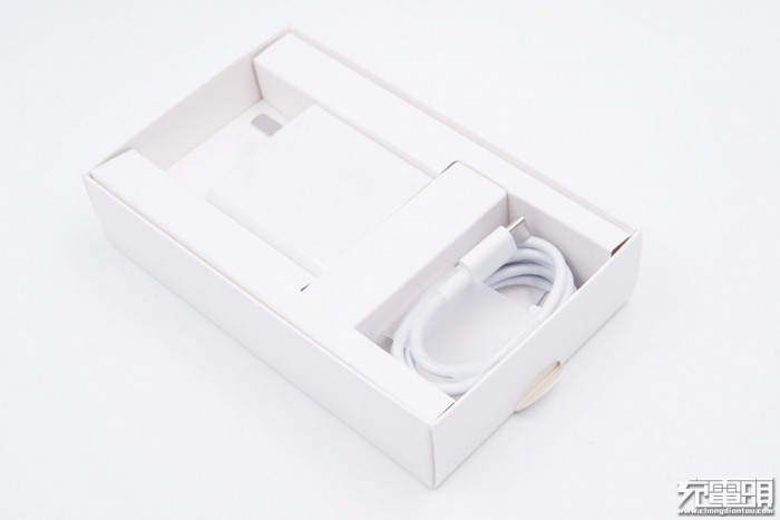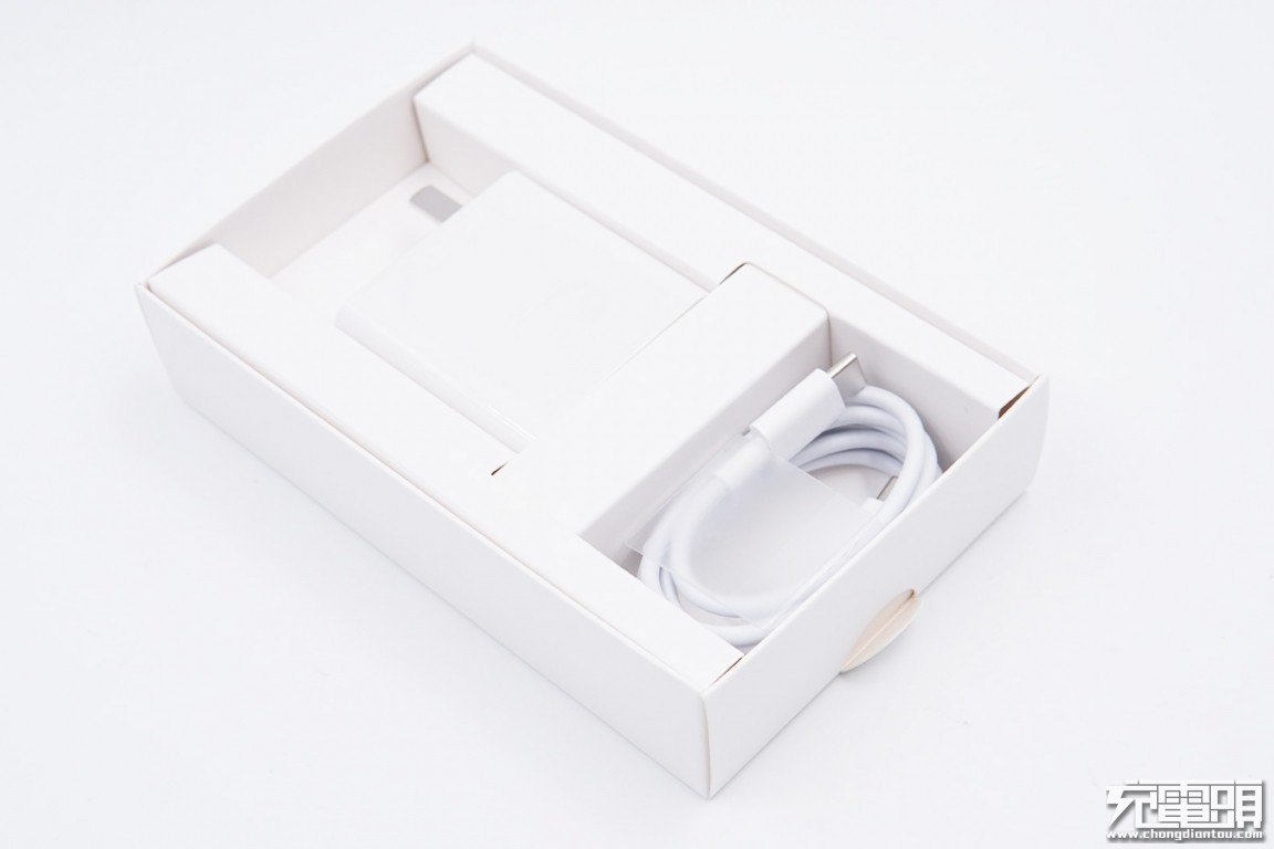 包装盒使用纸质内衬,除了充电器外,还有一条数据线。