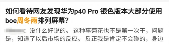 截至2020年1月,华为Mate20/Mate20 Pro系列销量1600w,华为P30/P30 Pro系列销量2000w,Mate30/Mate 30 Pro系列销量1200w。均采用了三星与LG、BOE三家供应商的搭配,并且都没有采用业界最新技术。(2K分辨率、90Hz、120Hz)同时Mate20 Pro引发了“绿屏门”、P30 Pro引发了“周冬雨排列”热议。为何华为要花大价钱去购买“更差”的屏幕,是研发部门吃了回扣吗?显然不是。