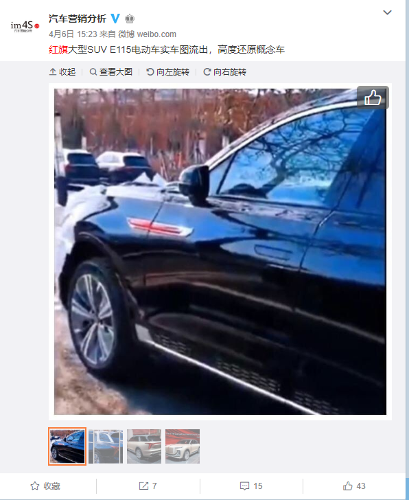近日,被誉为“中国版库里南”的红旗E115大型SUV概念车型量产版实车照却遭到流出,其整体造型高度还原概念车型,保持了霸气的风格。从网友曝光的图片来看,虽说实车前脸部分未遭到公开,但从量产版整体车型来看,已高度还原概念车的轮廓和设计,包括前翼子板处的红色饰条、主流的隐藏式门把手设计等。
