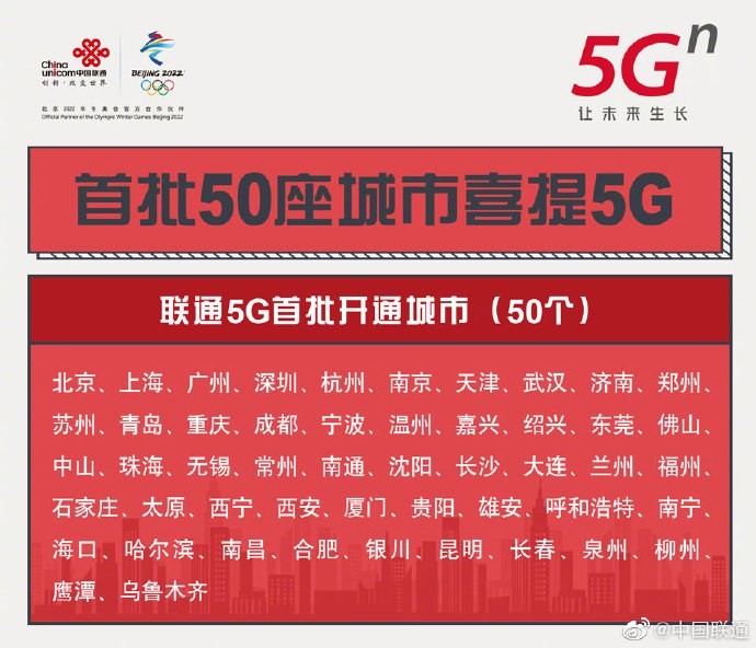 中国联通首批50个5G商用城市