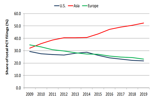在2019年,中国通过《专利合作条约》机制提交了58990件专利申请,相比2018年的53355件增加了5000多件,位列世界第一。