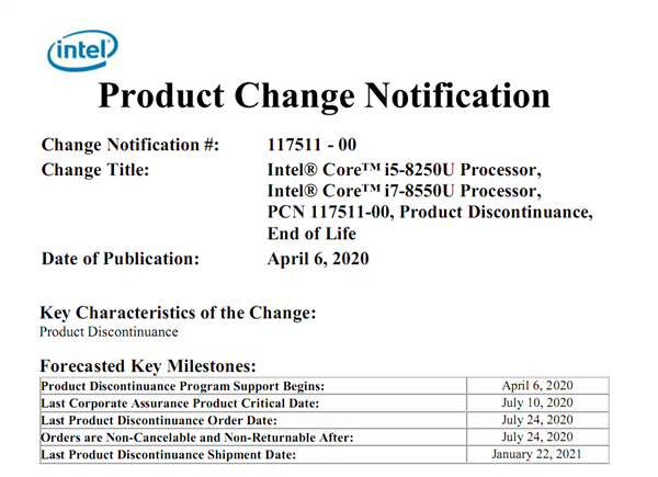 根据最新通告,i5-8250U、i7-8550U将在2020年7月24日之后停止接受订单,2021年1月22日停止出货;i5-8350U、i7-8650U能多活三个月,2020年10月23日之后停止接单,2021年4月9日后断货。