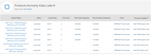 事实上,Kaby Lake-U Refresh家族还有两款低端产品,奔腾金牌4417U和赛扬3867U,他们都是去年初才发布的,刚刚一年多,仍会存在一段时间。
