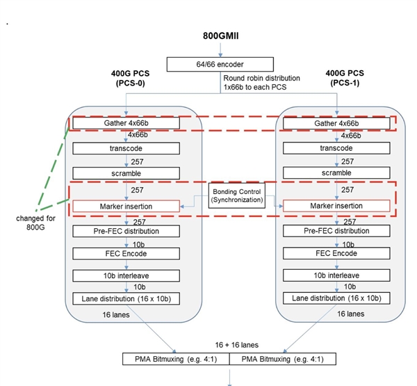 800Gbe网络使用了两路400Gbe PCS组合而成,全双工模式,信号编码64/66b标准,总计8条106Gbit/s通道,最终实现了800Gbe的速度。