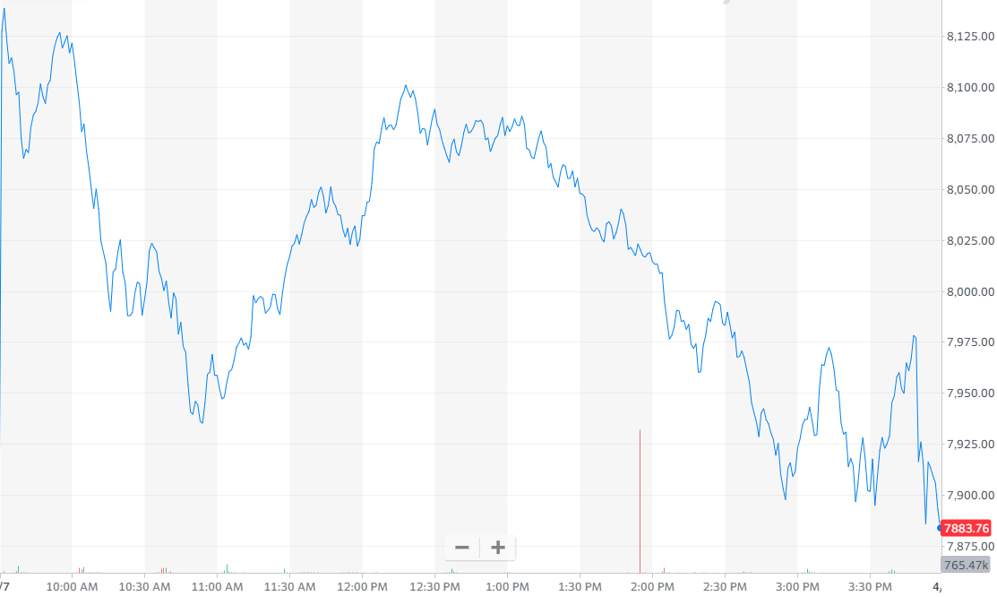 北京时间4月8日消息,星期二美股高开低走,小幅收跌。截至收盘,道指跌26.13点,跌幅为0.12%,报收22653.86点;标普500指数跌4.27点,跌幅为0.16%,报收2659.41点;纳指跌25.98点,跌幅为0.33%,报收7887.26点。