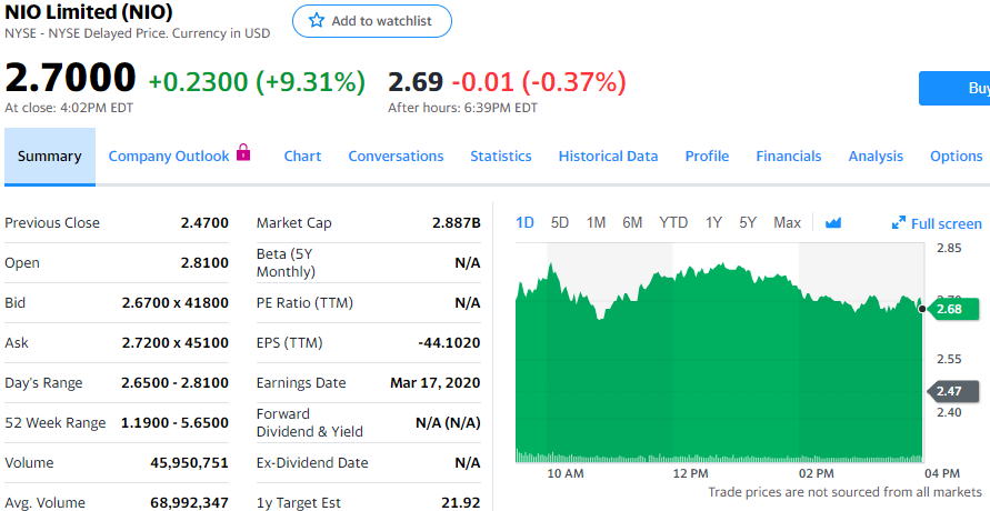 蔚来昨天披露了2020年3月份汽车交付量数据。3月份蔚来交付了1533辆汽车,环比增长116.8%,主要原因是产量在逐步提高。蔚来3月份交付的汽车包括1479辆ES6和54辆ES8。蔚来计划从4月份开始交付全新ES8车型。截至2020年3月31日,蔚来累计交付了35751辆ES8和ES6,其中今年第一季度为3838辆,比公司预期范围中位值高9.7%。蔚来董事长、CEO李斌表示,在供应链合作伙伴的大力支持下,3月份产量在逐步恢复。除继续通过网络销售外,蔚来专卖店人流量也在逐步恢复。在用户社区的支持下,自2月份以来蔚来订单在不断增长。蔚来首席财务官奉玮表示,鉴于目前中国疫情已基本得到控制,公司将继续与供应链合作伙伴密切合作,恢复正常生产。蔚来将整合线上和线下销售渠道,以进一步推动订单增长。今天常规交易中,蔚来股价上涨0.23美元,涨幅为9.31%,报收于2.7美元。