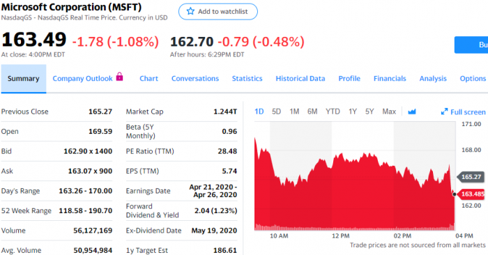 疫情下的居家远程办公大潮,使云服务股受到投资者关注,“首当其冲”的就是微软。Wedbush证券公司丹尼尔·艾维斯(Daniel Ives)星期一发表投资报告,维持对微软的“增持”股票评级和210美元目标股价。今天常规交易中,微软股价下跌1.78美元,跌幅为1.08%,报收于163.49美元,盘中一度摸高170美元。艾维斯在报告中称,“微软大部分市值与其云服务产品有关。我们认为,疫情将成为企业部署云服务环境的转折点/催化剂。我们预期2022年33%-55%的工作量将转向云服务,看来是保守的,这个预期可能提前1年实现。”IBD的数据显示,微软股价正在接近190.8美元的买入点,相对强弱指数为95,这意味着它在过去12个月的表现好于95%的股票。星期一,微软股价收于50日均线上方。上周五,加拿大皇家银行资本市场发表投资报告,对微软股票评级为“增持”,把目标股价定为200美元。