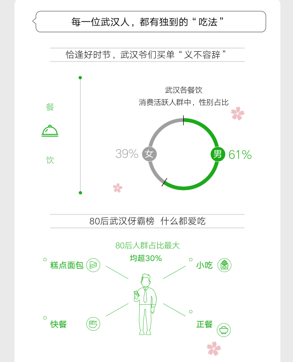 数据显示,在武汉的餐饮消费人群中,61%都是男性,当中80后人群占比最大,无论快餐正餐小吃糕点,80后都是常客,而消费甜品冷饮最多的是90后,在消费群体中占比超过36%。