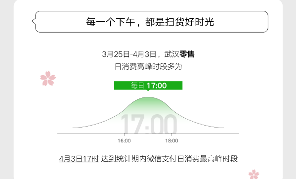 微信支付“武汉春讯”大数据显示,武汉老百姓衣食住行各方面消费开始出现日常“高峰时段”的迹象,还原重启中的“武汉十二时辰”。